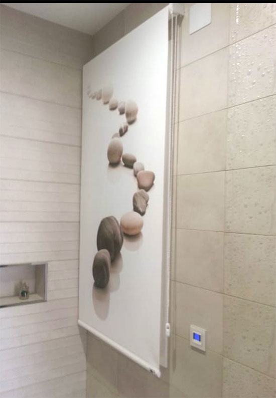 Para los baños con una decoración mas minimalista, o con bastante dibujo en los azulejos, podemos seleccionar los estores enrollables lisos.